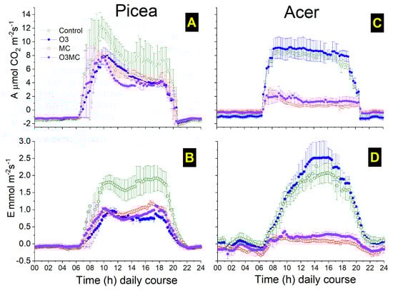 Figure 5. Average daily course of leaf gas exchange (A,C: Aarea net CO2 assimilation; B,D: transpiration) in response to elevated ozone (O3), metal contamination (MC), and the combination of the two treatments (O3MC) vs. control (CO) treatment (mean values ± SE, n = 3 trees). The measurements were performed from 23 August to 23 September (Picea abies) and from 31 July to 31 August (Acer pseudoplatanus), with the ozone dose (AOT40) increasing from 17 to 22 (Picea) and from 11 to 14 (Acer) ppm·h in the ozone treatment chamber during that period (Figure A1E). All daily course measurements (4 per hour) were realised in situ, using lateral current year shoots (Picea) or top leaves (Acer).