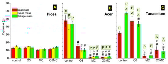 Figure 6. Changes in the total root, wood, and attached foliage dry mass of Picea abies (A), Acer pseudoplatanus (B), and Tanacetum vulgare (C) plants by the end of the first year of the experiment in response to elevated ozone (O3), metal contamination (MC), and the combination of the two treatments (O3MC) vs. control (CO) treatment (mean values ± SE, n = 5 plants). Significance (p < 0.05 pairwise Tukey’s studentised range test comparisons): significantly different from CO (#) and O3 (o) treatment (n.s. differences between MC and O3MC); significantly different from Picea/Acer (framed P/A), same treatment. See Table A3 for the significance of the experimental factors.