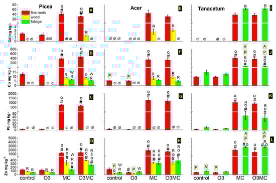 Figure 7. Changes in the concentration of metal contaminants in the fine root, current-year wood, and foliage fractions of Picea abies (AD), Acer pseudoplatanus (EH), and Tanacetum vulgare (IL) plants by the end of the first year of the experiment in response to elevated ozone (O3), metal contamination (MC), and the combination of the two treatments (O3MC) vs. control (CO) treatment (mean values ± SE, n = 5 plants). Detection limit (dl) for Cd/Cu/Pb = 1.5/4.5/1.5 mg kg−1. Significance (p < 0.05 pairwise Tukey’s studentised range test comparisons): significantly different from CO (#), O3 (o), and MC (§) treatment from the root (R) and wood (W) fraction within the same species and treatment, and from Picea/Acer within the same organ and treatment (framed P/A). See Table A4 for the significance of the experimental factors.
