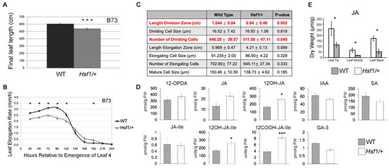 Hsf1 growth and phytohormone phenotypes. (A) Barplots of WT and Hsf1/+ final leaf lengths. Error bars = SE. (B) Average leaf elongation rate (LER) of leaf #4 of Hsf1/+ and WT siblings in the B73 inbred background. Error bars = SE. (C) Kinematic analysis comparing growth zones of the Hsf1/+ mutant and its WT sibling. (D) Two-week-old whole-seedling hormone profile of Hsf1/+ and WT siblings. 12-OPDA, 12-oxophytodienoic acid; JA, Jasmonic Acid; 12OH-JA, 12-hydroxy-jasmonic acid; IAA, Indole-3-Acetic Acid; SA, Salicylic Acid; JA-Ile, Jasmonoyl Isoleucine; 12OH-JA-Ile, 12-hydroxy-jasmonoyl-isoleucine; 12COOH-JA-Ile, 12-carboxy-jasmonoyl-isoleucine; GA-3, gibberellic acid. (E) Jasmonic Acid (JA) concentration across leaf #9 at steady-state growth. The leaf was divided into three sections (leaf base, leaf middle, and leaf tip). Leaf base included the growth zone. White columns are Hsf1/+ and gray columns are WT sibling. Asterisks mark significant p-value differences (* p < 0.05, *** p < 0.001) calculated from a two-tailed Student’s t-test.