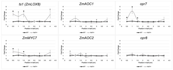 JA pathway genes are upregulated in the growth zone of Hsf1 leaves. RT-qPCR of key JA biosynthesis and signaling genes across the division zone in Hsf1/+ and wild-type leaf #4 at steady-state growth. Asterisks and daggers mark significant differences by a one-tailed Student’s t-test. p-values * ≤ 0.05, † < 0.10.
