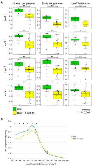 Effect of JA on B73 leaf growth. (A) Boxplots of sheath length, blade length, and blade width for leaves #1–#4 in control and 1 mM JA treated seedlings. Horizontal bars represent the maximum, third quantile, median, first quantile, and minimum values respectively. Each dot is a plant (B73, n = 23; B73 + JA, n = 22). Asterisks mark significant differences by Student’s t-test. (B) Average leaf elongation rate (LER) of leaf #4 at steady-state growth of control and 1 mM JA treated seedlings. Error bars = SE. Asterisks mark significant differences of LER between treatments at each time point by Student’s t-test p-value ≤ 0.05 (B73, n = 27; B73 + JA; n = 22).