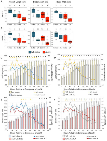 Since JA treatment further reduced Hsf1/+ blade size, we sought to determine whether the JA treatment was affecting the growth rate or duration of growth. To do this, LER and LED were determined for leaf #4 of the seedlings from the 1 mM JA-treated 1:1 segregating Hsf1 and wild-type seeds (as above). As seen previously, compared to the untreated wild-type siblings, the untreated Hsf1/+ had a reduced LER and extended LED (Figure 4C). Also similar to our results with JA-treated B73, JA-treated wild-type LED was not affected but LER was reduced, which was especially evident in the first 2.5 days of growth (Figure 4D). In contrast, Hsf1/+ LER, especially during the first 2.5 days of steady-state growth, was not affected by JA treatment. Instead, LED was reduced by JA treatment in Hsf1/+ plants where steady-state growth began to slow starting at 3 days, instead of 5 days, and continued to slow until leaf growth stopped by day 8 (Figure 4E). Finally, JA-treated wild-type and JA-treated Hsf1/+ growth showed similar growth patterns to what was seen for these genotypes without JA treatment (Figure 4F). Thus, although Hsf1/+ blade length can be reduced further by JA treatment, it is likely caused by a shortened LED, since LER was not impacted. This can be seen when comparing the actual leaf length (sheath length + blade length) of growing leaf #4 from both genotypes with and without JA treatment (Figure 4C–F). The leaf length was reduced at each time point during leaf growth for wild-type vs. Hsf1/+, for wild-type vs. JA-treated wild-type, and for JA-treated wild-type vs. JA-treated Hsf1/+ (Figure 4C,D,F). In contrast, Hsf1/+ vs. JA-treated Hsf1/+ showed the leaf length was not different until after 7 days of leaf growth, nearly the time growth stopped (Figure 3E). This suggests that, in Hsf1/+ mutants, where steady-state leaf growth is reduced, possibly by increased JA content, additional JA can further reduce leaf size by truncating the duration of growth.