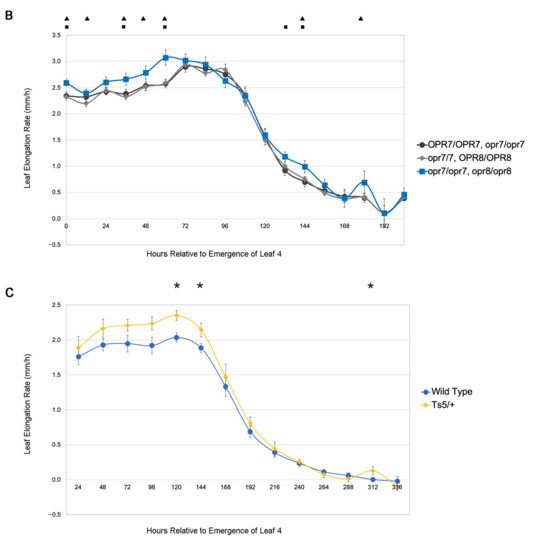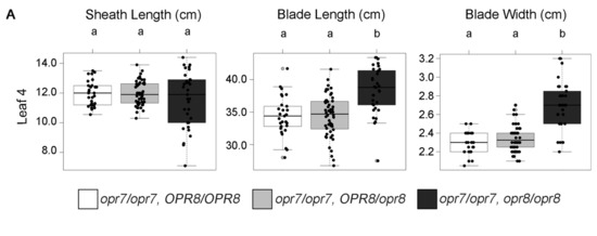 Our data are consistent with previous work showing JA can reduce growth. This implies that reduced endogenous JA accumulation may enhance growth, leading to larger leaves. To understand how endogenous concentrations of JA might affect leaf growth and size, we measured the leaf size and growth in a number of JA-deficient maize mutants [32,36]. Duplicate genes encode 12-OXO-PHYTODIENOIC ACID REDUCTASE (OPR), a key enzyme in the JA biosynthetic pathway responsible for converting OPDA into (+)-7-iso-JA, which is later modified into bioactive JA [36]. Plants homozygous for recessive null mutations in both the opr7 and opr8 genes are JA-deficient, display a feminized tassel or “tasselseed” phenotype, and have longer seedling leaves #1 and #2 [36]. A single functional opr allele at either locus is sufficient for maintaining wild-type levels of JA content and plant phenotype. Using a population that was homozygous null for the opr7-5 allele and segregating for wild-type and null opr8-2 alleles, we assessed the leaf size and leaf growth in JA-sufficient and JA-deficient genotypes (Figure 5A,B). As was shown previously, the leaf #1 and #2 sheath and blade lengths of the JA-deficient genotype were increased by 20%–48%, and the leaf #3 and #4 blade length were increased by 13%–24% (Figure 5A,B and Supplemental Table S4). Interestingly, the sheath length was increased for leaf #3 but decreased in leaf #4 in the opr7 opr8 double mutant (Supplemental Table S4). We also noted that the blade width increased in leaf #3 and #4 by 9%–18% in the JA-deficient genotype. Overall, in opr7 opr8 double mutants, increases in sheath and blade length diminished from leaf #1 to #4 but the blade width was smaller than wild-type in leaf #1 but larger than wild-type in leaf #4. An assessment of the growth rate in the double opr7 opr8 mutant revealed an increase in LER and LED compared to the JA-sufficient genotypes (Figure 5B). This suggested the lack of JA increased both the rate and the duration of leaf growth.