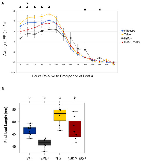 Using the population described in Figure 5C, we next compared the LER and LED of single and double mutants. Hsf1/+ mutants had reduced LER and an extended LED compared to wild-type, as seen from the previous characterization of Hsf1/+ growth (Figure 1B, Supplemental Figure S1B,C). Ts5/+, as stated in Figure 5C, had increased LER compared to WT. Interestingly, the average LER for the double mutant Hsf1/+ Ts5/+ closely matched the wild-type, except for at the 48 hr time point, where WT LER slightly exceeded the Hsf1/+ Ts5/+ LER (Figure 6A). An analysis of the final leaf lengths of the entire population showed that combining Hsf1/+ and Ts5/+ resulted in a final leaf length similar to wild-type plants (Figure 6B).