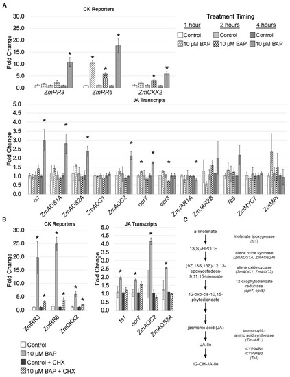 Since the expression of several JA pathway genes was higher in the leaf growth zone of the Hsf1 CK hypersignaling mutant, we asked if exogenous CK application to maize inbred seedlings could also induce JA pathway gene expression in the leaf growth zone. To do this, 10-day-old B73 seedlings were cut at the root–shoot junction, and shoots were incubated for 1, 2, and 4 h with 10 µM 6-BAP (details in Section 5). After incubation, the basal 2 cm of leaf #4, encompassing the division zone and part of the expansion zone, was collected, and gene expression was quantified using qRT-PCR. We first determined that the exogenous CK application was perceived by assessing the expression of three CK early-response genes: the type A response regulators ZmRR3 and ZmRR6, and cytokinin oxidase2 (ckx2). Type A response regulators are negative regulators of CK signaling that are rapidly expressed without de novo protein synthesis upon CK treatment [43,44]. As expected, ZmRR6 transcripts were upregulated in the growth zone by 1 h, and all three CK reporters showed robust expression by 4 h (Figure 7A). Thus, the growth zone of leaf #4 was perceiving and responding to the CK application by 4 h. We next assessed the JA pathway expression in these same tissues. Of the genes surveyed, we found an increase in the expression of both the JA biosynthesis and catabolism genes. Specifically, ts1, aos1a, aos2a, aoc2, opr7, and Ts5 all showed a 1.5- to 3-fold increase in expression after 4 h of CK treatment. This showed that CK could induce JA pathway gene expression in the growth zone after 4 h.