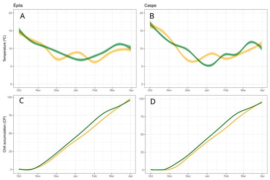 Temperature in (A) La Almunia de Doña Godina and in (B) Caspe. Chill accumulation in (C) La Almunia de Doña Godina and in (D) Caspe from October to April in the seasons 2017–2018 (green) and 2018–2019 (yellow).