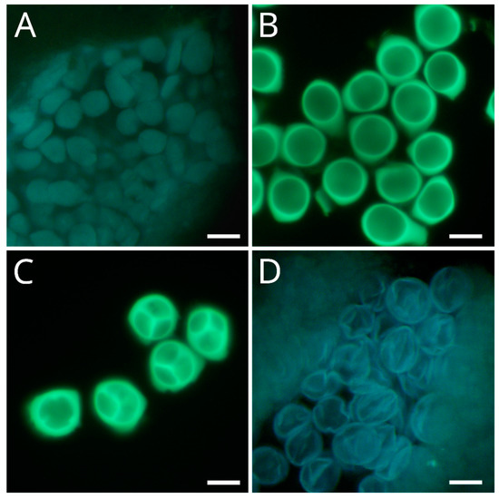 In the first stage, the sporogenous tissue, composed of pollen mother cells, was observed in the earlier sampling dates that were considered the endodormancy phase (Figure 2A). Then, each pollen mother appeared isolated by a surrounding callose layer; thus, meiosis was ongoing (Figure 2B). The process of meiosis terminated with the division into four meiotic subproducts with the formation of callose inner walls (tetrads) (Figure 2C). The presence of callose as an indicator of male meiosis occurring was considered the transition from endo- to ecodormancy. Finally, the young microspores were released after the degradation of the callose layers at ecodormancy (Figure 2D). This process lasted up to about 5 days in the different apricot cultivars analyzed.
