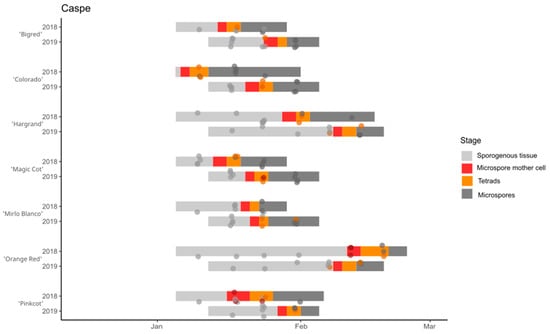 The anther developmental stages for the seven apricot cultivars grown in Caspe for two years (2018 and 2019). The dots indicate the observations, and the bars indicate the estimation of each developmental stage.