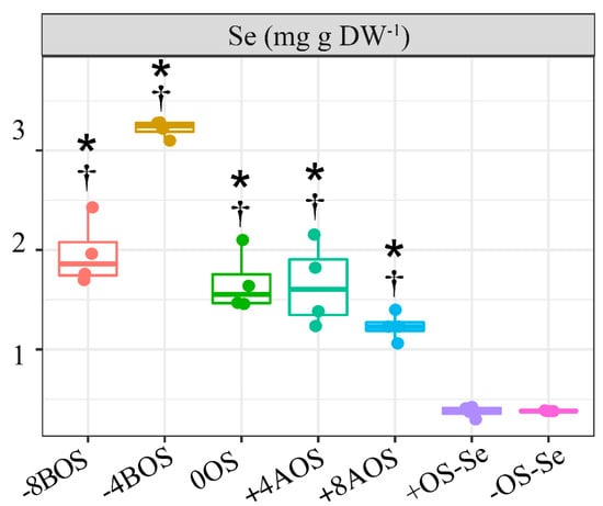 Leaf Se content as a result of Se application in Coffea arabica cv. Catuaí seedlings under osmotic stress induced with PEG-6000. The values displayed are the distribution of four replicates. Asterisks refer to the significant difference when comparing all treatments with non-stressed plants without Se supply (−OS-Se) (p < 0.05). Dagger refers to the significant difference when comparing all treatments with stressed plants without Se supply (+OS-Se) (p < 0.05). Treatments: −8BOS—application of Se 8 days before stress (stressed plants); −4BOS—application of Se 4 days before stress (stressed plants); 0OS—application of Se on the day of stress occurrence (stressed plants); +4AOS—application of Se 4 days after stress (stressed plants); +8AOS—application of Se 8 days after stress (stressed plants); +OS-Se—without Se (stressed plants); and −OS-Se—without Se (non-stressed plants).