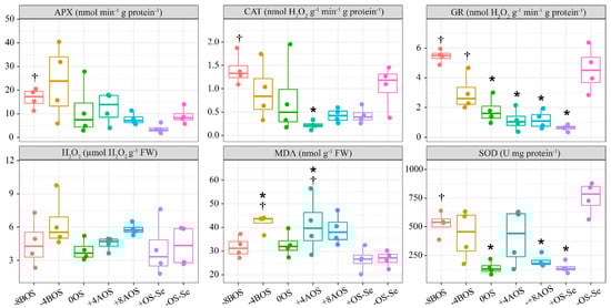 Hydrogen peroxide (H2O2), and lipid peroxidation (MDA) content, and activity of leaf antioxidant enzymes as a result of Se application in Coffea arabica cv. Catuaí seedlings under osmotic stress induced with PEG-6000. The values displayed are the distribution of four replicates. Asterisks refer to the significant difference when comparing all treatments with non-stressed plants without Se supply (−OS-Se) (p < 0.05). Dagger refers to the significant difference when comparing all treatments with stressed plants without Se supply (+OS-Se) (p < 0.05). Treatments: −8BOS—application of Se 8 days before stress (stressed plants); −4BOS—application of Se 4 days before stress (stressed plants); 0OS—application of Se on the day of stress occurrence (stressed plants); +4AOS—application of Se 4 days after stress (stressed plants); +8AOS—application of Se 8 days after stress (stressed plants); +OS-Se—without Se (stressed plants); and −OS-Se—without Se (non-stressed plants).