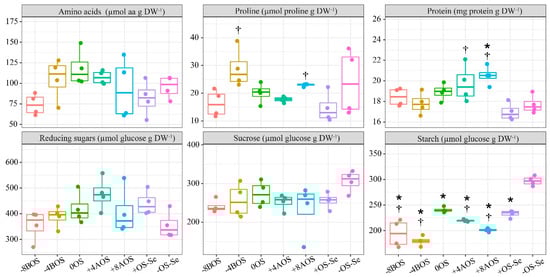 Total free amino acids (AA), proline (Pro), carbohydrates, and protein (Prt) as a result of Se application in Coffea arabica cv. Catuaí seedlings under osmotic stress induced with PEG-6000. The values displayed are the distribution of four replicates. Asterisks refer to the significant difference when comparing all treatments with non-stressed plants without Se supply (−OS-Se) (p < 0.05). Dagger refers to the significant difference when comparing all treatments with stressed plants without Se supply (+OS-Se) (p < 0.05). Treatments: −8BOS—application of Se 8 days before stress (stressed plants); −4BOS—application of Se 4 days before stress (stressed plants); 0OS—application of Se on the day of stress occurrence (stressed plants); +4AOS—application of Se 4 days after stress (stressed plants); +8AOS—application of Se 8 days after stress (stressed plants); +OS-Se—without Se (stressed plants); and −OS-Se—without Se (non-stressed plants).