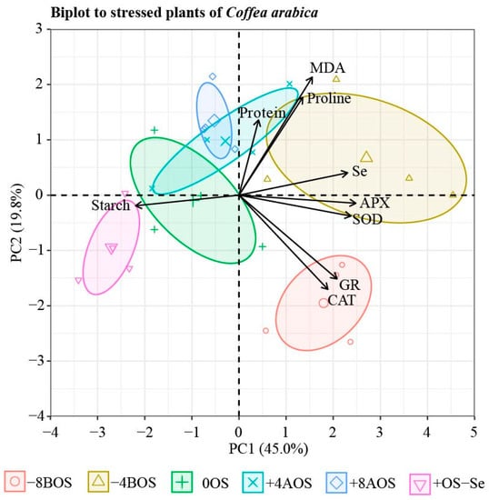 Principal component analysis (PCA) of leaf compounds and Se content in leaves. The leaf attributes included were leaf Se content (Se); ascorbate peroxidase (APX); superoxide dismutase (SOD), catalase (CAT), glutathione reductase (GR); proline; protein; lipid peroxidation (MDA), and starch. Arrows represent the contribution of leaf compounds on the principal component axes. Treatments: −8BOS—application of Se 8 days before stress (stressed plants); −4BOS—application of Se 4 days before stress (stressed plants); 0OS—application of Se on the day of stress occurrence (stressed plants); +4AOS—application of Se 4 days after stress (stressed plants); +8AOS—application of Se 8 days after stress (stressed plants); +OS-Se—without Se (stressed plants); and −OS-Se—without Se (non-stressed plants).