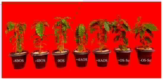 Coffea arabica cv. Catuaí seedlings under osmotic stress induced with PEG-6000 and Se foliar application. Treatments: −8BOS—application of Se 8 days before stress (stressed plants); −4BOS—application of Se 4 days before stress (stressed plants); 0OS—application of Se on the day of stress occurrence (stressed plants); +4AOS—application of Se 4 days after stress (stressed plants); +8AOS—application of Se 8 days after stress (stressed plants); +OS-Se—without Se (stressed plants); and −OS-Se—without Se (non-stressed plants).