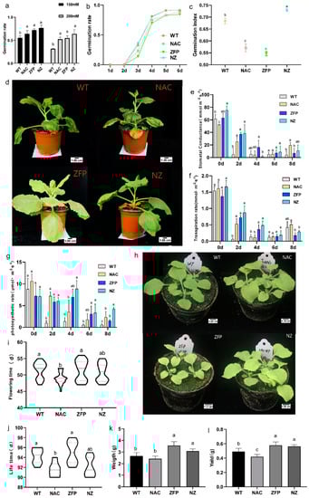 For the changes in germination of transgenic lines, we studied the growth traits of transgenic lines. At three weeks after planting, ZFP lines had only developed about 3.5 expanded leaves, whereas WT, NAC, and NZ lines had developed 4.5 leaves. Upon observing the leaf size, we found that ZFP had smaller leaves. Fewer and smaller leaves indicated ZFP’s early stage growth inhibition (Figure 1h and Figure S1).