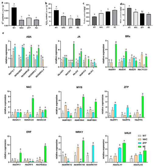 The effect of single-gene overexpression (NAC and ZFP) versus double gene co-expression (NZ) on tolerance to 10% PEG6000 osmotic stress treatment. (a) O2− content; (b) H2O2 content; (c) Proline content; (d) MDA content; (e) transcription factor regulation involved in tobacco drought response. The superscript letters in the table represent the differences between different genotypes, and different letters indicate significant differences (p < 0.05), data are means ± SEM.