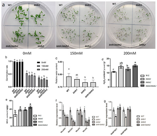 The effect of bhlh1, bhlh2, and bhlh1bhlh2 knock-out on properties related to drought response. Properties in panels a and b were in plants subjected to mannitol osmotic stress; properties in panels c to g were measured on leaves of pot-grown plants that were subjected to drought by withholding water for 7 days. (a) germination and growth of bhlh1, bhlh2, and bhlh1bhlh2 in control and mannitol medium; (b) germination rate of bhlh1, bhlh2, and bhlh1bhlh2 under mannitol treatment; (c) relative water content of bhlh1, bhlh2, and bhlh1bhlh2; (d) H2O2 content; (e) MDA content; (f) expression of genes in the JA signaling pathway; and (g) gene expression of MYB transcription factors. The superscript letters in the table represent the differences between different genotypes, and different letters indicate significant differences (p < 0.05), data are means ± SEM.