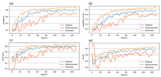 Due to the scarcity of samples, complex image backgrounds, and imbalanced data distribution in the original dataset, using it to train an object detection model results in instability and a tendency toward premature convergence. After multiple training epochs, we selected the best-performing model, as shown by the original curve, which achieved a mAP@0.5 of 70.93%. By applying the appropriate image augmentation techniques, the mAP@0.5 based on YOLOv8 improved to 75.94%. After further incorporating the images generated via our proposed model, the mAP@0.5 reached 87.17%. Notably, the improvements in precision and recall were also significant.