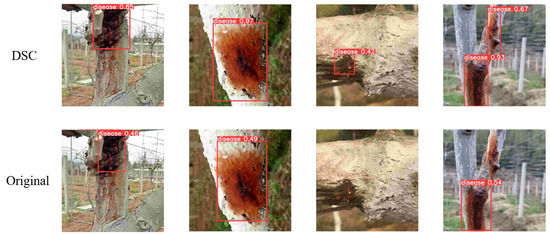 In the above figure, it can be observed that the quality of the images generated after the introduction of DSC is improved, the overall authenticity and generation of local features are more realistic, the disease is easier to detect via YOLOv8, and the level of detection confidence is higher.