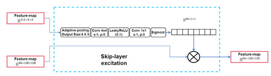 where and denote the input feature maps and the output feature maps of the SLE module, respectively. The function represents the operations performed on , and represents the module weights to be learned. Figure 8 illustrates the SLE module connected to the 128 × 128 and 8 × 8 resolutions, where and correspond to the feature maps at 8 × 8 and 128 × 128 resolutions, respectively. Initially, first down-sampled the feature map to 4 × 4 using an adaptive average-pooling layer. Subsequently, further down-sampling to 1 × 1 was applied using a 4 × 4 operation. After the activation function, LeakyReLU, which was a 1 × 1 convolution layer, was utilized to project into the same channel shape as . Finally, after passing through a Sigmoid function, the output from was multiplied by along the channel dimension. This multiplication yielded , which possessed a shape identical to .