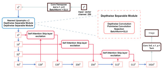 In this study, we proposed a redesign of the generator of FastGAN by incorporating depth-wise separable convolution and the GAM (global attention module) [24] to enhance the generative capability of the network with minimal additional computational effort and without compromising the computational speed. The structure of our generator is defined as shown in Figure 9: