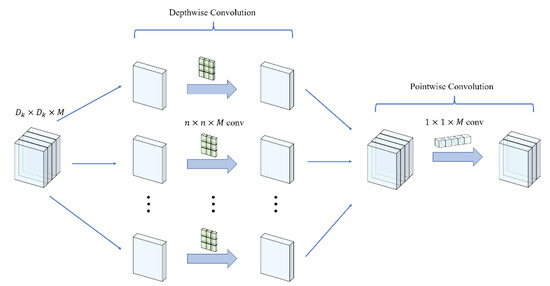 Convolution, in the context of neural networks, is the process of extracting features from input by sliding windows over the data. It can be visualized as zooming in and capturing an image at each step using a magnifying glass and stitching these images together to form a larger picture. Convolution is currently a fundamental operation in computer vision tasks. The prevailing trend is to construct increasingly deep and complex networks to attain higher levels of accuracy. However, this often results in larger numbers of parameters and slower computation speeds. To address these challenges, depth-wise separable convolution [17] has emerged as a technique that decomposes the regular convolution into two separate parts: a depth-wise convolution and a point-wise convolution. In our network structure, the depth-wise convolution individually applied a filter to each input channel, performing a channel-by-channel convolution operation. Following this step, a point-wise convolution was applied, combining the outputs of the depth-wise convolution with a 1 × 1 convolution to achieve feature fusion between different channels. By utilizing depth-wise separable convolution, we achieved effective feature extraction while decreasing the quantity of parameters and maintaining computational efficiency. The depthwise separable convolution is shown in Figure 10: