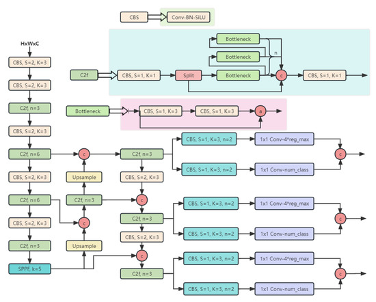 The YOLOv8 backbone network replaced the C3 structure of YOLOv5 with the C2f structure, which facilitated richer gradient flow and used a different number of channels to create different scales of the model, substantially enhancing the model’s performance. In terms of the head component, YOLOv8 adopted a decoupled head structure, which separated the classification and detection heads, gaining more flexibility and specialization, leading to improved performance in object recognition and localization. Furthermore, YOLOv8 replaced the anchor-based approach used in previous versions with an anchor-free method. The data augmentation part of training introduced the operation of closing Mosaic augmentation to the last 10 epochs from YOLOX [35] to effectively improve the accuracy. The structure of YOLOv8 is illustrated in Figure 14.