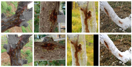 The images used in this paper were captured at the Ya’an kiwifruit plantation in Dujiangyan, Sichuan Province, China. A Canon EOS60D DSLR camera with a resolution of 1920 × 1080 pixels was utilized to capture the dataset. After removing the redundant background via data processing techniques such as center cropping, we obtained a high-quality 520 × 520-pixel kiwifruit trunk disease dataset. The initial few-shot dataset consisted of 128 images, which laid the foundation for the subsequent experiments and analysis.