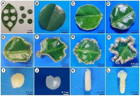Induction of somatic embryogenesis in C. canephora. (A) Leaf explants were obtained from plantlets 14 days after the preconditioning stage in MS medium, supplemented with 0.54 μM NAA and 2.32 μM KIN. (B–D) Circular explants at 7, 14, and 21 days, respectively, after induction of SE in Yasuda [] medium supplemented with 5 µM BA. (E–H) Circular explants at 28, 35, 42, and 56 days, respectively, after induction of SE. (I–L) Embryos at different stages of development (globular, heart, torpedo, and cotyledonary, respectively).