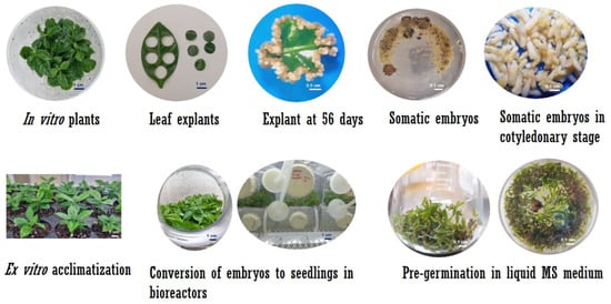 - Monja-Mio, K.M.; Herrera-Alamillo, M.Á.; Robert, M.L. Somatic embryogenesis in temporary immersion bioreactors. In Somatic Embryogenesis: Fundamental Aspects and Applications; Loyola-Vargas, V.M., Ochoa-Alejo, N., Eds.; Springer: Cham, Switzerland, 2016; pp. 435–454. [Google Scholar]