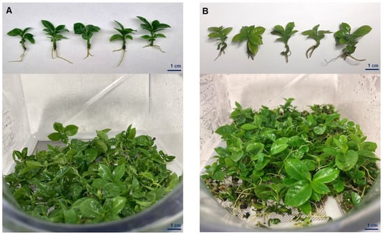 Coffea spp. grown in SETISTM temporary immersion bioreactors. (A) C. arabica and (B) C. canephora plantlets were evaluated after ten weeks of culture.