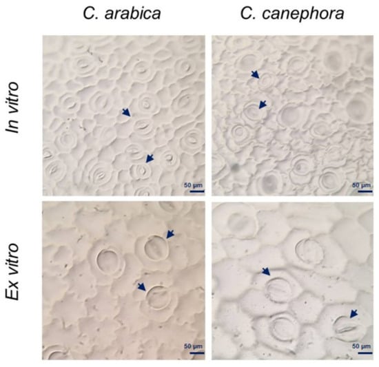 Epidermal impressions of the abaxial surface of the leaves. Presence of stomata and epidermal cells of in vitro and ex vitro plantlets of C. arabica and C. canephora. Arrows indicate plant stomata.