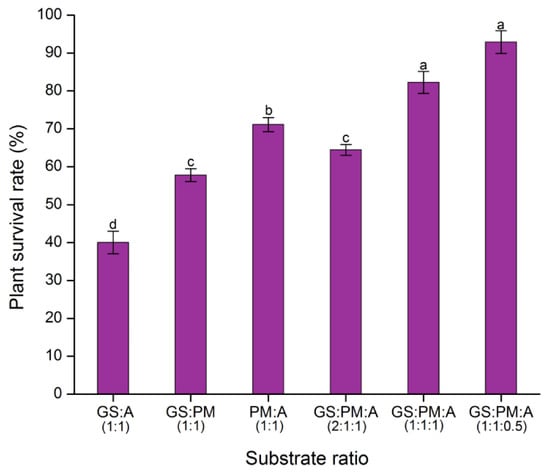 The mixture of garden soil, peat moss, and agrolite in proportion (1:1:0.5) proved to be one of the most effective substrate proportions for the acclimation of Coffea plantlets grown in bioreactors. On the other hand, the transplanted plantlets in mixtures of garden soil, peat moss, and agrolite with proportions of 1:1:1 and 1:1:0.5, respectively, did not differ significantly (Figure 7). Considering the expense of the inputs for the ex vitro acclimatization of the plantlets, the optimal substrate was a mixture of garden soil, peat moss, and agrolite (1:1:0.5). After five weeks of acclimation in the substrate, we found that the survival of the plants was rich, reaching 91.1% in the substrate GS:PM:A (1:1:0.5). The lower survival rate was seen in the substrate GS:A, reaching 40% (Figure 7).