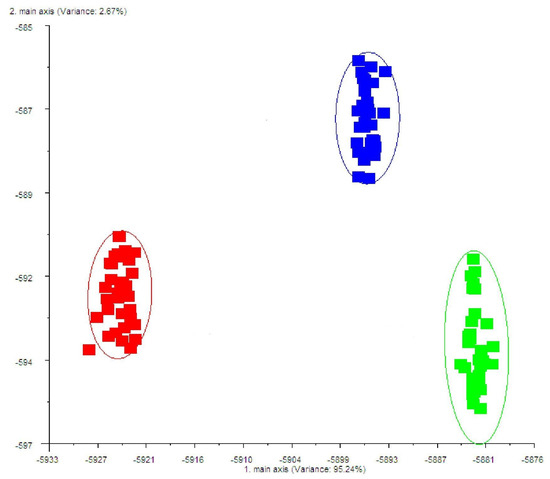 The LDA plots of the milk odours from different dietary treatments, which were assessed by using PEN 3.5, are shown in Figure 1. The e-nose output data were analysed using linear discriminant analysis (LDA) to evaluate the capability of e-nose PEN 3.5 to discriminate between milk odour profiles as a function of dietary treatments. Two discriminant functions (LD) were obtained that explained 95.24% and 2.67% of the total variance, respectively (Figure 1).