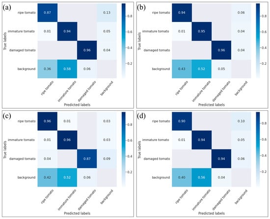 Confusion matrices for the (a) Yolov5m model, (b) modified-Yolov5m-BoTNet model, (c) modified-Yolov5m-ShuffleNet v2 model, and (d) modified-Yolov5m-GhostNet model.