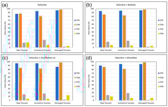 Figure 2 shows the TPR, TNR, FPR, and FNR values of the four models. As shown, the modified-Yolov5m-BotNet model had the best TPR performance over the three classes of tomatoes, with a value in the range of 94–96%. All four models had a low FPR, with values in the range of 2–19%. The FNR rates of the modified-Yolov5m-BotNet model were the lowest among all the models, with values in the range of 4–6%. All four models had high TNR values ranging from 80 to 82% for both ripe and immature tomatoes. Moreover, all four models achieved a TNR value close to 98% for damaged tomatoes.