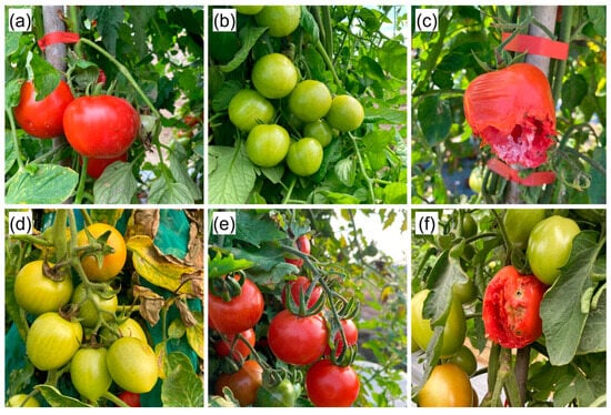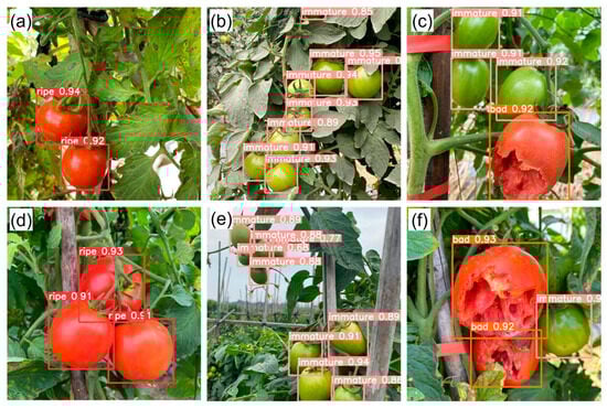Real-world detection results obtained using the modified-Yolov5m-BoTNet model for: (a) ripe tomatoes, (b) immature tomatoes, (c) immature and damaged tomatoes, (d) ripe tomatoes, (e) immature tomatoes, and (f) damaged and immature tomatoes.