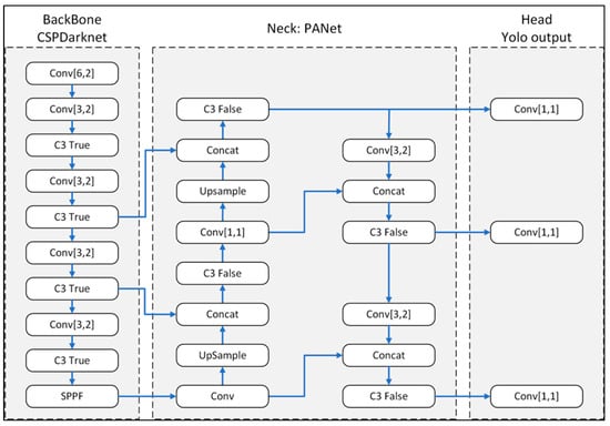 Figure 5 shows the basic structure of the Yolov5m model consisting of three blocks, namely the backbone, neck, and head. The data are first input to the backbone, which is implemented with CSPDarrknet. The backbone consists mainly of a C3 module (cross-stage partial network bottleneck with 3 convolutions), which improves on the CSPResBlock module in Yolov4 through the use of a single convolution layer and thus increases the training speed and reduces the number of training parameters. The backbone additionally incorporates a Spatial Pyramid Pooling Fast (SPPF) module. The SPPF module is similar to that of the Spatial Pyramid Pooling (SPP) module in Yolov4. However, SPPF is two times faster than SPP and employs kernels of different sizes in order to increase the receptive field and enable the processing of input images with a greater size variation. The neck block (PANet) uses multiple convolution and concatenation (Concat) blocks to extract feature pyramids from the input images. The neck also contains an Upsample module to enhance the subsample recognition accuracy. Finally, the head block, also known as the object detection module, predicts the coordinates of the bounding box (position, dimensions) for each target object of interest in the input image.