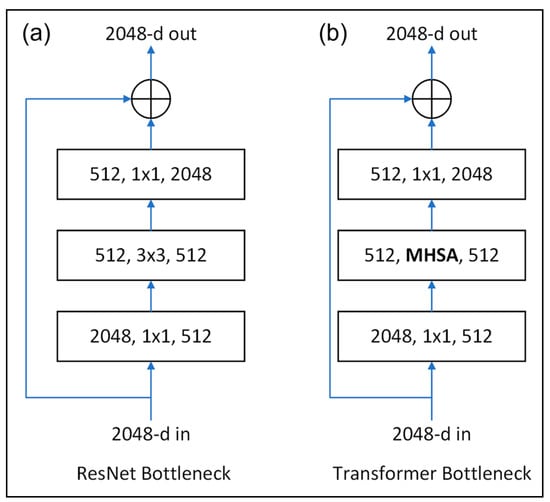 Srinivas et al. [35] proposed a BoTNet transform model with the ability to detect and classify not only whole objects of different classes, but also segments of objects of the same class. The model was based on the bottleneck block structure used in ResNet [36]. As shown in Figure 6a, the ResNet bottleneck block comprises three consecutive convolution operations, including a 1 × 1 convolution to reduce the number of feature depths, a 3 × 3 convolution to extract features from images, and a 1 × 1 convolution to increase the number of feature depths relative to the original input. In the bottleneck architecture, the input values changed progressively from 2048 to 512 and then back to 2048. In other words, the output value was equal to the original number of dimensions. As shown in Figure 6b, the BoTNet model [35] was implemented using a transformer bottleneck block, in which the 3 × 3 convolution operation in ResNet50 was replaced with a Multi-Head Self-Attention (MHSA) module. It was shown in [35] that the combined use of convolutions and the MHSA improved the average precision (AP) of the mask by around 1.2% for the Common Objects in Context (COCO) instance segmentation benchmark.