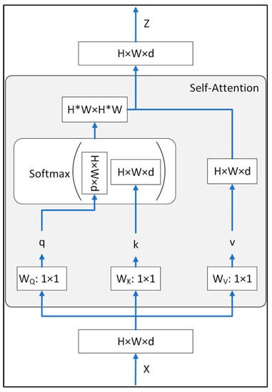Figure 7 shows the structure of the MHSA module. As shown, the module extracts long-range structural data from the input images [37,38,39,40]. The MHSA is used to connect components in the highest feature map. As a result, it provides access to a receptive field that includes all of the input images, and hence, the precision of a particular pixel is influenced by every input pixel. The MHSA module has three inputs, named the matrices of the queries (Q), keys (K), and values (V), denoted as Wq, Wk, and Wv, respectively. The self-attention module is calculated separately in multiple heads before being combined through another embedding, and the independent self-attention outputs are then concatenated and linearly transformed into the expected dimension. The multiple self-attention headers allow self-attention to be paid to different parts of the sequence. The MHSA is calculated as:
