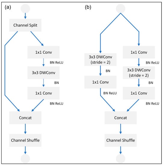 Deep learning network models are becoming more and more accurate. However, this performance improvement is often obtained at the expense of a very large number of parameters, which increases the training cost and prevents their deployment on weak hardware devices, such as mobile devices. Several lightweight deep learning models have been developed to address this problem, including MobileNet, NASNETMobile, and ShuffleNet v2 [41,42,43]. ShuffleNet v2 is an extension of the original ShuffleNet model proposed in [44] with pointwise group convolutions, bottleneck structures, and channel shuffle operations, and it was designed to further optimize the efficiency of the original structure. ShuffleNet v2 contains multiple shuffle units, which repeat different strides for different numbers of times. Figure 9 illustrates the structure of the shuffle unit. As shown in Figure 9a, the shuffle unit network includes channel split, concatenation, and channel shuffle blocks. After the initial channel split operation, one of the branches passes directly to the concatenation block, while the other branch contains two 1 × 1 ungrouped convolutions and a depth-wise convolution (DWConv) block. The outputs of the two branches are merged with the Concat block to ensure the same number of inputs and outputs. The channel shuffle block then allows for information exchange between the two branches. Figure 9b shows the structure of the spatial down-sampling module in the shuffle unit network. As shown, the split channel block is omitted, thus minimizing the number of input parameters and improving the speed as a result.