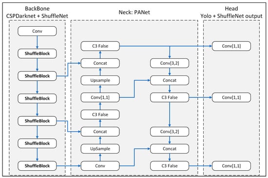 In the present study, ShuffleNet v2 was integrated with Yolov5m in order to improve the efficiency of the training process. In particular, the backbone structure of the original Yolov5m model was implemented using stacked Shuffle blocks in order to reduce the number of training parameters and giga floating point operations per second (GFLOPs) (see Figure 10).