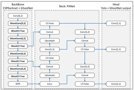 In this study, the GhostNet model was incorporated into the backbone of Yolov5m in order to increase the number of layers while simultaneously reducing the GFLOP score. As shown in Figure 12, the modified component of the backbone structure consisted of GhostC3 cross-stage partial network bottlenecks with three convolutions and GhostConv convolution blocks.