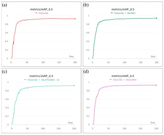 mAP values of: (a) Yolov5m, (b) modified-Yolov5m-BoTNet, (c) modified-Yolov5m-ShuffleNet, and (d) modified-Yolov5m-GhostNet.