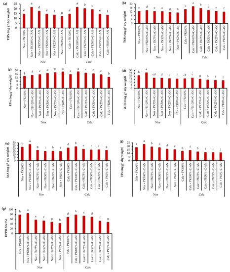 Interactive effect of soil type (ST) and compost with phosphate (P)–potassium (K)-solubilizing Aspergillus niger (PK+C-AN) level on leaf biochemical attributes, e.g., (a) total soluble proteins (TSPs), (b) total soluble sugars (TSSs), (c) free proline (FPro), (d) reduced glutathione (rGSH), (e) ascorbic acid (AsA), (f) total phenolics (TPs), and (g) 2,2-diphenyl-1-picrylhydrazyl-scavenging activity (DPPH-SA). PK100% = 72 kg P2O5 ha−1 + 60 kg K2O ha−1, PK75% = 54 kg P2O5 ha−1 + 45 kg K2O ha−1, PK50% = 36 kg P2O5 ha−1 + 30 kg K2O ha−1, PK25% = 18 kg P2O5 ha−1 + 15 kg K2O ha−1, PK0% = 0 kg P2O5 ha−1 + 0 kg K2O ha−1, and compost was added with a rate of 20 t ha−1. Normal (Nor) and calcareous (Calc). Each bar is expressed as the mean ± standard error of the mean (n = 3). Bars labeled with same letters are not significantly different according to the Duncan test (p ≤ 0.05). Values based on average of 2021/22 and 2022/23 seasons.