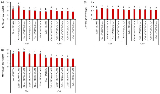 Interactive effect of soil type (ST) and compost with phosphate (P)–potassium (K)-solubilizing Aspergillus niger (PK+C-AN) level on leaf nutrients, e.g., nitrogen—N (a), phosphorus—P (b), potassium—K+ (c), calcium—Ca2+ (d), iron—Fe2+ (e), zinc—Zn2+ (f), and manganese—Mn2+ (g) contents. PK100% = 72 kg P2O5 ha−1 + 60 kg K2O ha−1, PK75% = 54 kg P2O5 ha−1 + 45 kg K2O ha−1, PK50% = 36 kg P2O5 ha−1 + 30 kg K2O ha−1, PK25% = 18 kg P2O5 ha−1 + 15 kg K2O ha−1, PK0% = 0 kg P2O5 ha−1 + 0 kg K2O ha−1, and compost was added with a rate of 20 t ha−1. Normal (Nor) and calcareous (Calc). Each bar is expressed as the mean ± standard error of the mean (n = 3). Bars labeled with same letters are not significantly different according to the Duncan test (p ≤ 0.05). Values based on average of 2021/22 and 2022/23 seasons.