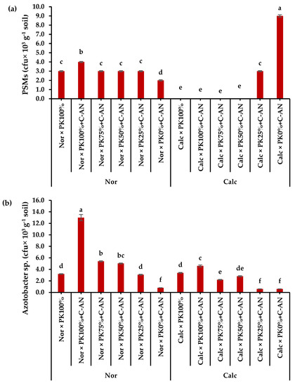 In the current research, the phosphate-solubilizing microorganism population increased in calcareous soil treated with C-AN without PK fertilization, while the Azotobacter sp. population increased in normal soil treated with high levels of PK fertilization plus C-AN (Figure 3a and b). Long-term NPK mineral fertilization decreased the community of phosphate-solubilizing microorganisms compared to long-term manure fertilization, which increased total carbon and N, regulated the soil pH, and provided favorable conditions for microorganisms [48,78].