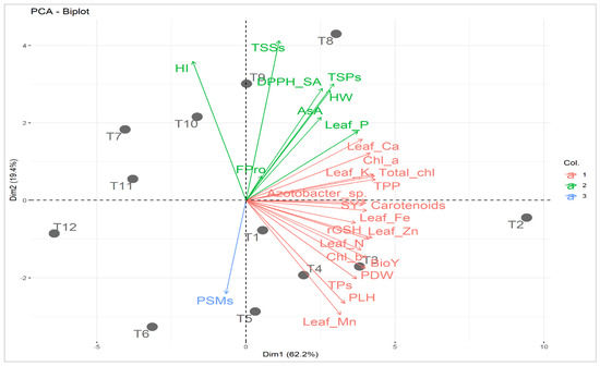 Principal component biplot (PCA) for applied treatments (soil type + bio-organo-mineral applications) and studied attributes. T1: Nor + PK100% = the normal soil received the full recommended dose (FRD) of phosphorus (P) and potassium (K) fertilizers; T2: Nor + PK100%+C-AN = the normal soil received PK100% + 20 t compost ha−1 + PK-solubilizing Aspergillus niger; T3: Nor + PK75%+C-AN = the normal soil received 75% out of FRD of P and K fertilizers + 20 t compost ha−1 + PK-solubilizing Aspergillus niger; T4: Nor + PK50%+C-AN = the normal soil received 50% out of FRD of P and K fertilizers + 20 t compost ha−1 + PK-solubilizing Aspergillus niger; T5: Nor + PK25%+C-AN = the normal soil received 25% out of FRD of P and K fertilizers + 20 t compost ha−1 + PK-solubilizing Aspergillus niger; T6: Nor + PK0%+C-AN = neither P nor mineral K fertilizer was added to the tested normal soil; T7: Calc + PK100% = the calcareous soil received FRD of P and K fertilizers; T8: Calc + PK100%+C-AN = the calcareous soil received PK100% + 20 t compost ha−1 + PK-solubilizing Aspergillus niger; T9: Calc + PK75%+C-AN = the calcareous soil received 75% out of FRD of P and K fertilizers + 20 t compost ha−1 + PK-solubilizing Aspergillus niger; T10: Calc + PK50%+C-AN = the calcareous soil received 50% out of FRD of P and K fertilizers + 20 t compost ha−1 + PK-solubilizing Aspergillus niger; T11: Calc + PK25%+C-AN = the calcareous soil received 25% out of FRD of P and K fertilizers + 20 t compost ha−1 + PK-solubilizing Aspergillus niger; T12: Calc + PK0%+C-AN = neither P nor mineral K fertilizer was added to the tested calcareous soil. Chl a: chlorophyll a; Chl b: chlorophyll b; Total chl: total chlorophyll; TPP: total photosynthetic pigments; TSPs: total soluble proteins; TSSs: total soluble sugars; Fpro: free proline; rGSH: reduced glutathione; AsA: ascorbic acid; TPs: total phenolics; DPPH-SA: 2,2-diphenyl-1-picrylhydrazyl-scavenging activity; N: nitrogen; P: phosphorus; K+: potassium; Ca2+: calcium; Fe2+: iron; Zn2+: zinc; Mn2+: manganese; PSMs: phosphorus-solubilizing microorganisms; PLH: plant height; PDW: plant dry weight; HW: hectoliter weight; SY: seed yield; BioY: biological yield; and HI: harvest index. Col.: color. Values based on average of 2021/22 and 2022/23 seasons. Each dot (•) indicates a treatment number.