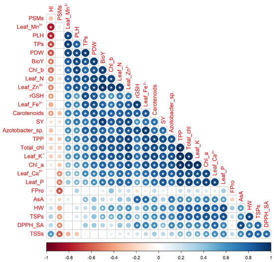 Pairwise comparisons among selected quinoa crop traits based on the data of soil types × bio-organo-mineral treatments shown in the correlogram are based on Pearson’s correlation coefficients. The circle color in the correlogram corresponds to the correlation coefficient, wherein a positive correlation coefficient is closer to 1 (purple end of the scale) and a negative correlation coefficient is closer to −1 (red end of the scale). The circle size matches the significance level. Chl a: chlorophyll a; Chl b: chlorophyll b; Total chl: total chlorophyll; TPP: total photosynthetic pigments; TSPs: total soluble proteins; TSSs: total soluble sugars; Fpro: free proline; rGSH: reduced glutathione; AsA: ascorbic acid; TPs: total phenolics; DPPH-SA: 2,2-diphenyl-1-picrylhydrazyl-scavenging activity; N: nitrogen; P: phosphorus; K+: potassium; Ca2+: calcium; Fe2+: iron; Zn2+: zinc; Mn2+: manganese; PSMs: phosphorus-solubilizing microorganisms; PLH: plant height; PDW: plant dry weight; HW: hectoliter weight; SY: seed yield; BioY: biological yield; and HI: harvest index. (*) refers to significant Person’s correlation at p ≤ 0.05. Values based on average of 2021/22 and 2022/23 seasons.