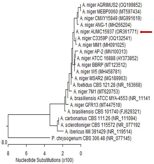 The fungal isolate was cultured in sterile Petri plates containing 20 mL of autoclaved Czapek’s yeast extract agar (CYA) and incubated at 28 °C for 5 days [88]. Patho-gene-spin DNA/RNA extraction kit (iNtRON Biotechnology Company, Sungnam, Korea) was used to extract DNA at the Molecular Biology Research Unit, Assiut University, Egypt. The extracted DNA was kept in a 1.5 mL autoclaved Eppendorf tube prior to shipping to SolGent Company, Daejeon, Republic of Korea, for polymerase chain reaction (PCR) and rRNA gene sequencing. The PCR was performed using forward 5′-TCCGTAGGTGAACCTGCGG-3′ (ITS1) and reverse 5′-TCCTCCGCTTATTGATATGC-3′ (ITS4) primers, which were incorporated into the reaction mixture. The purified PCR product was sequenced with the same primers with the addition of ddNTPs in the reaction mixture [89,90]. The Basic Local Alignment Search Tool (BLAST) available on the National Centre for Biotechnology Information (NCBI) database was used to analyze the acquired sequences. The phylogenetic sequence tree (Figure 6) was constructed using MegAlign software version 5.05 (DNA Star, Madison, WI, USA) according to Tamura et al. [91]. Based on ITS sequences of rDNA, the genomic sequence of our isolate was deposited in the NCBI GenBank database.